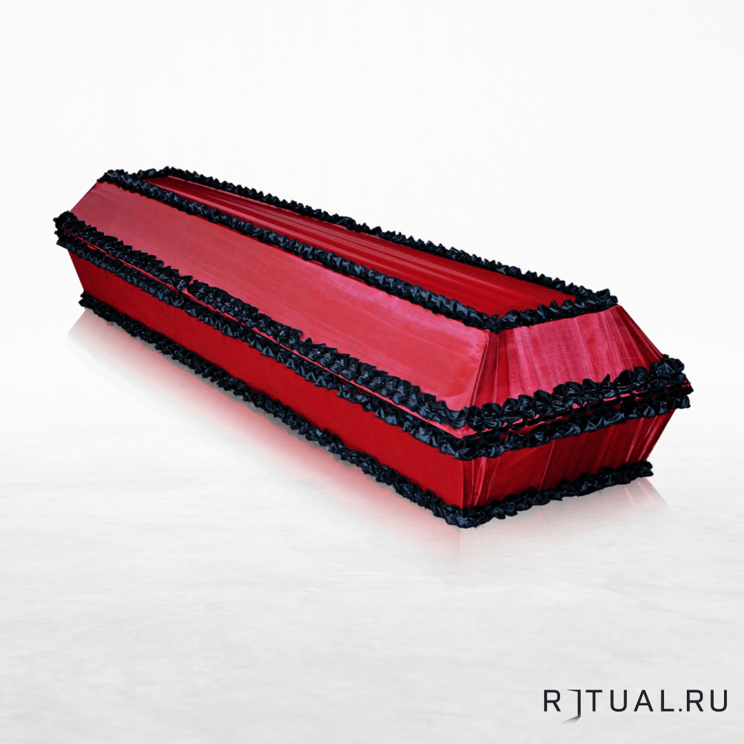 Похоронный атрибут имеет классический формат: широкое изголовье и зауженное изножье. Российский производитель для изготовления использовал сосновую доску. Наружная обивка: атлас алого колера, драпированный складкой в торцевой части. Дополнительно место стыка, верх и низ оторочены чёрным рюшем. Внутренне убранство: светлая материя. Размеры рассчитаны на умершего крупной комплекции: в длину 1600-2100 мм, в плечах 650-750 мм.