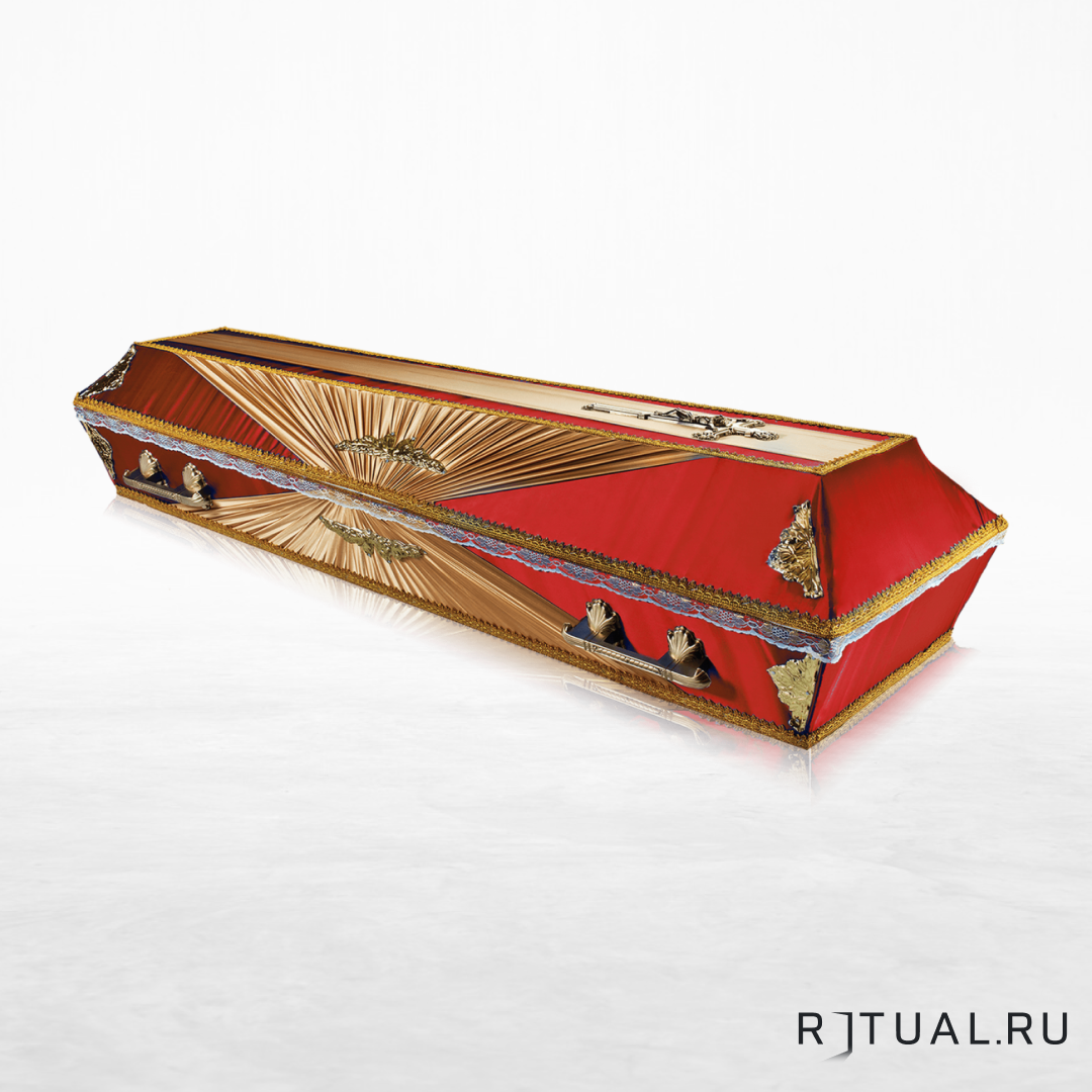 Траурное изделие выполнено по классическому образцу из сосновых пиломатериалов. Российский изготовитель использовал для наружной обивки ярко-алый атлас. Боковины задрапированы золотистой тканью с присборкой. В качестве дополнительного декора использованы угловые накладки и фестоны. Верх крышки оформлен полосой золотистой ткани и христианским распятием. Золотистым кантом оторочены верх, место стыка и низ похоронного аксессуара. Полупрозрачная белая лента кружева, выбивающаяся из-под крышки гроба, словно напоминает о необходимости смирения. Четыре ручки по бокам служат для удобства транспортировки. Вся фурнитура произведена из армированного пластика и покрыта позолотой. Внутреннее убранство: обивка из светлого атласа. Модель рассчитана на почивших солидных размеров: 1600-2100 мм в длину и 750-850 мм в плечах.
