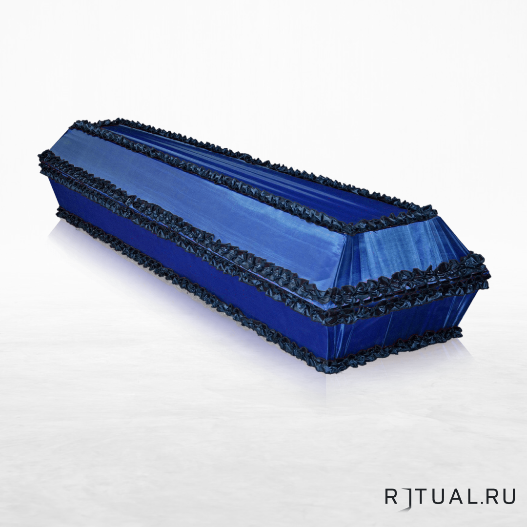 Траурное изделие от российского производителя выполнено из сосновых пиломатериалов. Снаружи гроб обит тёмно-синим атласом, уложенным в прямую складку в торцевой и верхней части. Дополнительная драпировка чёрным рюшем по месту стыка, верхнему и нижнему краям акцентируют внимание на трагичности церемонии. Внутренняя обивка выполнена из светлой материи. Параметры: 1600-2100 мм в длину и от 850 мм в ширину. Размеры модели рассчитаны на особо крупных людей и потому гроб изготавливается на заказ.